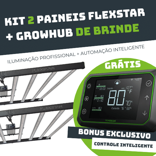 Com este kit você leva 2 Painéis LED Flexstar de alta eficiência + GrowHub totalmente GRÁTIS para controle do seu cultivo.
