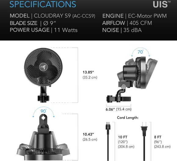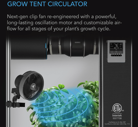 Um ventilador de clipe altamente inovador completamente redesenhado para fornecer circulação direcionada e otimizar cada estágio do ciclo de crescimento de sua planta. Acesse dez velocidades digitais mais dez modos de vento dinâmicos para um fluxo de ar personalizável que varia entre os níveis para simular um ambiente externo. Para um controle ainda maior, utilize os dez níveis de oscilação que fornecem circulação focada em pontos específicos ou oferecem o maior alcance possível. Este ventilador de circulação tem classificação IP44 para manter o desempenho máximo durante o uso contínuo, mesmo em alta umidade e temperatura. Ele também atende aos padrões ETL (certificado #5027708) para segurança de aparelhos elétricos, garantindo o uso seguro em aplicações de circulação de ar. Este produto faz parte da plataforma UIS™ de dispositivos de cultivo e controladores inteligentes, projetados para se unir ao aplicativo AC Infinity via WiFi para alcançar seu ambiente ideal.