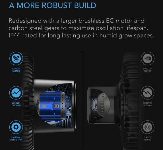 Apresenta um motor EC robusto que é especialmente redesenhado em tamanho e construção para prolongar a vida útil da oscilação. Ele utiliza um design de motor sem escovas, engrenagens de aço carbono resilientes e rolamentos de esferas duplas para montagem omnidirecional. Também é protegido por IP44 para suportar os espaços de cultivo mais úmidos. Esses componentes se unem para criar a construção de ventilador de clipe mais resistente que é duradoura, eficiente em termos de energia e pode gerar uma circulação poderosa.