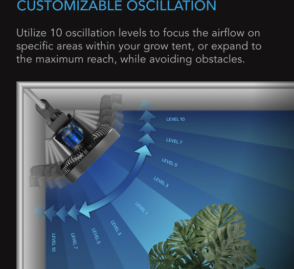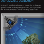 Obtenha recursos de personalização sem precedentes para controle completo do fluxo de ar usando os 10 níveis de velocidade deste ventilador de clipe de tenda de crescimento, 10 modos de vento dinâmico e 10 configurações de oscilação. Adapte exclusivamente cada estágio de desenvolvimento para uma experiência de crescimento totalmente personalizada. Nossa ampla seleção de modos dinâmicos permite que você decida a força máxima de seu fluxo de vento variável, garantindo um crescimento mais saudável com estresse reduzido em suas plantas. A faixa de oscilação oferece cobertura total da barraca, podendo evitar obstáculos. Com isso, você pode definir a circulação precisa para qualquer estágio de crescimento da planta, desde brisas ultra-suaves para germinação e mudas até um poderoso fluxo de ar para vegetação e floração.